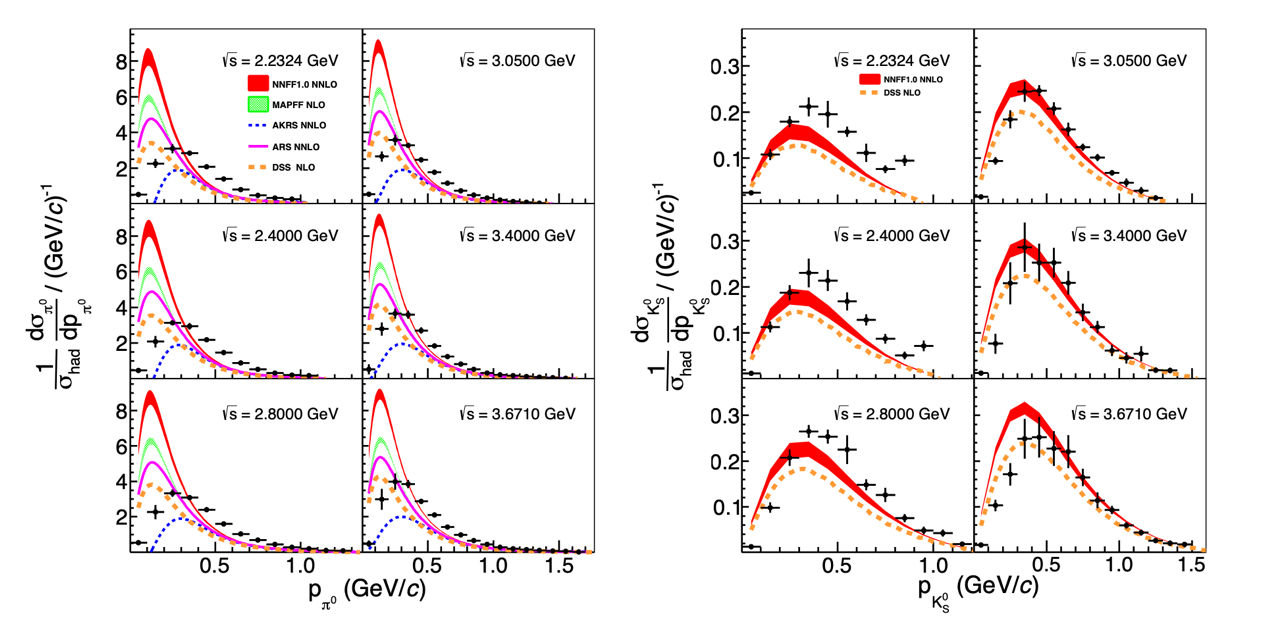 在工作中,利用北京谱仪BESIII数据,团队精确测量了中性pion和Kaon介子单举产生微分截面,最高精度达4%, 仅为现有实验数据误差的五分之一。基于现有一系列碎裂函数的理论计算均不能很好地描述实验结果。因此,该能区的实验测量为碎裂函数及强子化过程的研究提供了精确的实验数。