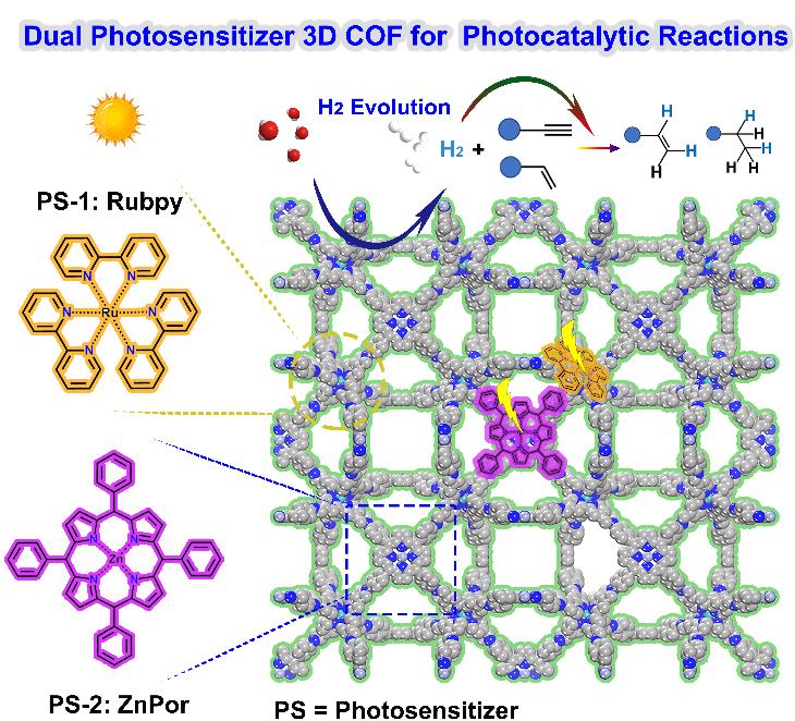 兰亚乾团队设计合成了一类双光敏剂耦合的金属-三维共价有机框架(MCOFs)材料用于高效光催化反应。研究团队创造性地将传统分子光敏剂金属吡啶配合物[如Ru(bpy)32+,Fe(bpy)32+]与卟啉或金属卟啉分子通过共价连接形成了晶态三维COFs,表现出了优异的光敏与催化性能。该类催化剂的光解水活性是已报道的COF基光催化剂的最高性能之一。此外,原位产生的氢气被成功用于进一步的有机加氢反应,以炔基化合物为底物达到了>99%的加氢转化效率。