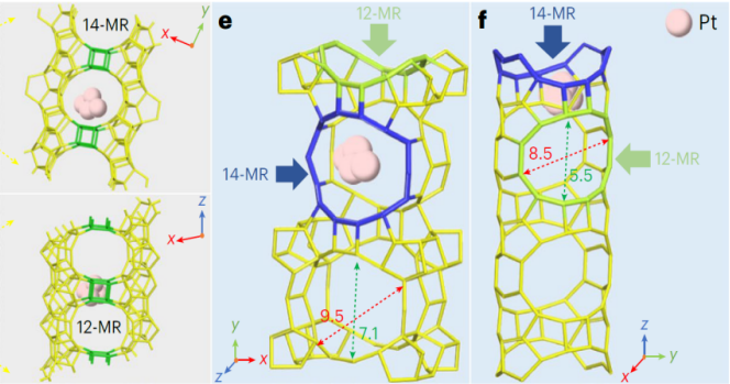 课题组利用积分差分相位衬度成像扫描透射电子显微镜,证实了亚纳米级的Pt团簇特异性地落位在UTL的14元环孔道内,表明Pt在UTL孔道中占据了特定位置,这与14元环孔道具有较大孔尺寸以及骨架Ge(锗)在双四元环结构单元的局部富集有关。
