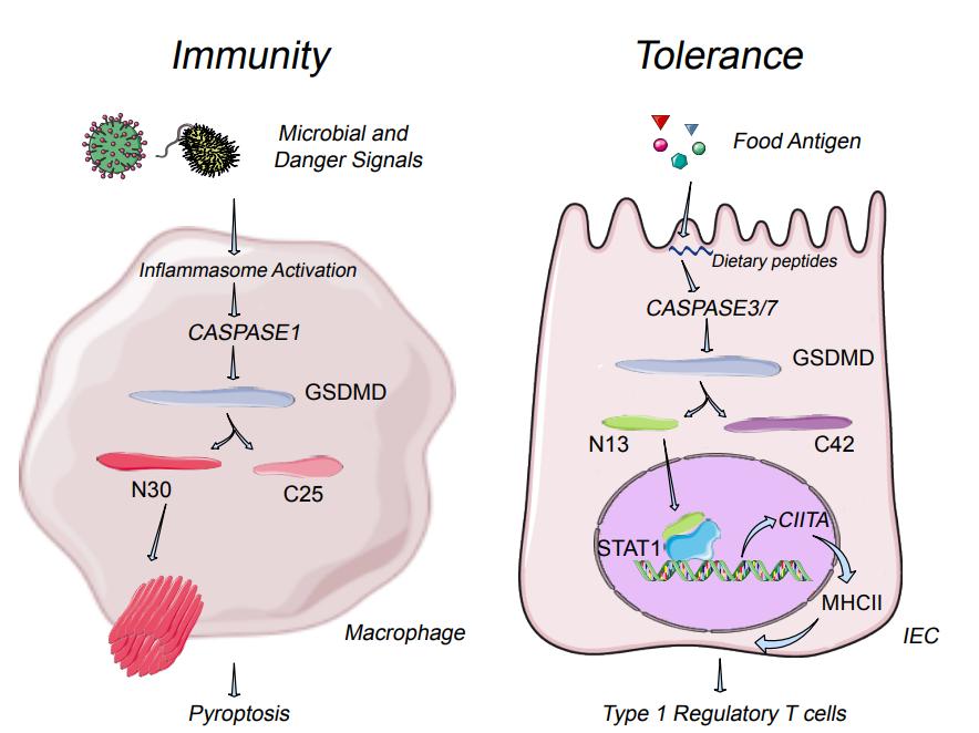 研究人员介绍,该工作详细阐述了GSDMD在前端小肠中,会在食物诱导下形成一个N13片段,该片段在核孔复合物帮助下入核,并辅助增强了STAT1对Ciita A(II 类主要组织相容性复合物反式激活因子)的转录调节,使小肠上皮细胞的主要组织相容性复合物二类分子表达增加,从而诱导Tr1的上调,最终促进食物耐受形成,为食物过敏的治疗手段提供新思路。