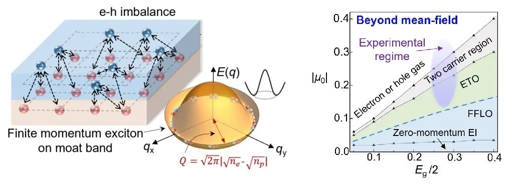 (左)在电子-空穴密度不平衡的双层量子阱中形成的moat 能带;(右)双层量子阱激子系统中的完整相图 课题组供图