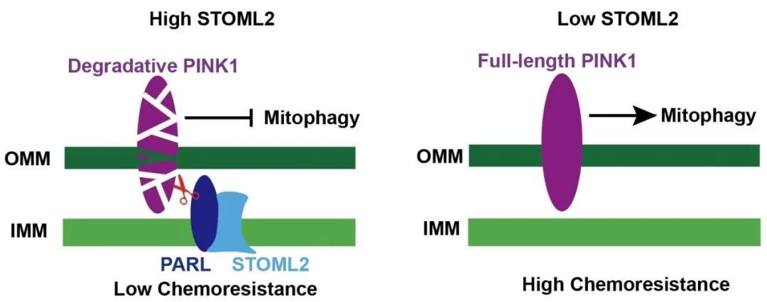 STOML2蛋白抑制胰腺癌细胞化疗耐药的示意图(OMM:线粒体外膜,IMM:线粒体内膜,北京协和医院供图)
