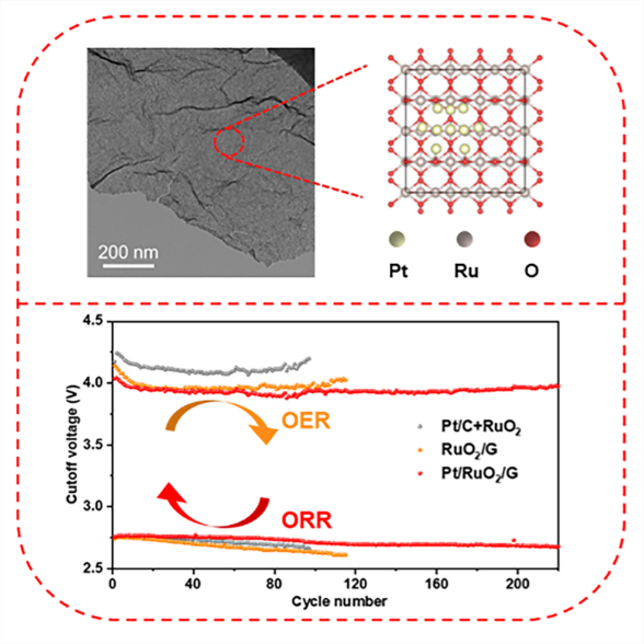 近日,中国科学院大连化学物理研究所催化基础国家重点实验室二维材料化学与能源应用研究组(508组)吴忠帅研究员团队与包信和院士团队合作,在开发高效、稳定双功能氧催化剂方面取得新进展,该成果利用空间限域效应,在石墨烯表面集成了先进的氧还原(ORR)催化剂Pt和氧析出(OER)催化剂RuO2(Pt/RuO2/G),成功实现了优异的OER/ORR及锂氧气电池性能。