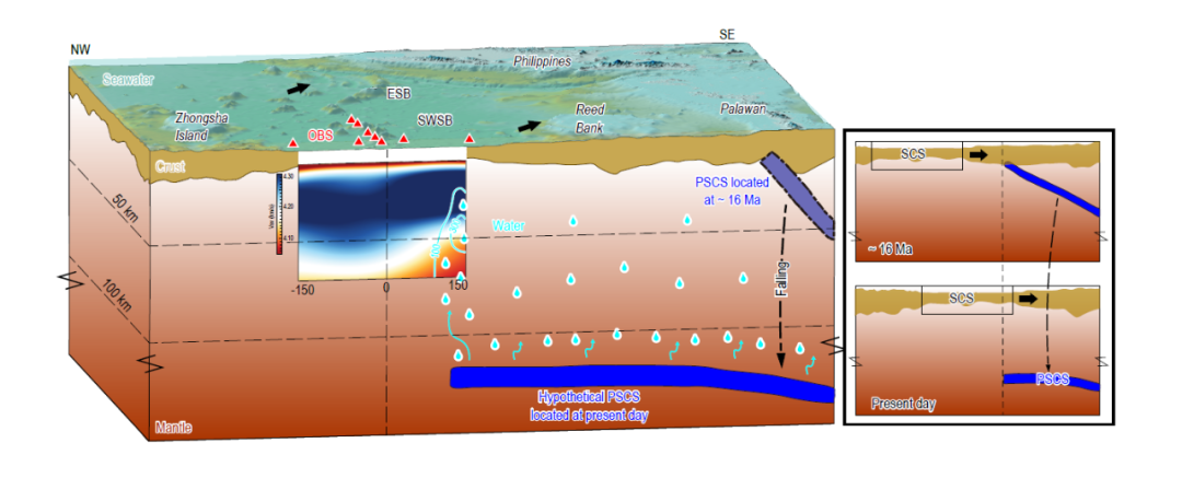 在南海西南次海盆,研究团队发现,海盆南部40-80公里深度存在一个明显的低地震横波速度异常区,且异常在约50公里深度处达到峰值。经过深度热力学与岩石地球化学分析,研究团队认为,南海南部的上地幔相对富水,推测这些水可能源于俯冲板片的脱水作用。