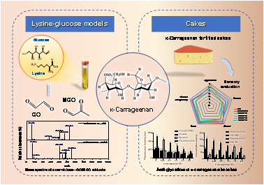 研究结果显示:六种典型的亲水胶体(琼脂,κ-卡拉胶,羧甲基纤维素,羟丙基二磷酸酯淀粉,角豆胶和果胶)中,κ-卡拉胶表现出最强的AGEs抑制活性。进一步的机理研究表明,κ-卡拉胶对二羰基化合物的清除作用可能是抑制AGEs生成的主要途径。在制备蛋糕的原料面粉中加入1%(w/w)的κ-卡拉胶后,荧光和非荧光AGEs的含量均显著降低,同时具有良好的品质属性和整体可接受性。此外,加入κ-卡拉胶的蛋糕中蛋白质氧化产物浓度也明显低于未添加组,证明其可能通过抑制蛋白质氧化来抑制AGEs的形成。本研究证明在烘焙食品中添加κ-卡拉胶是一种有效的AGEs减控策略。