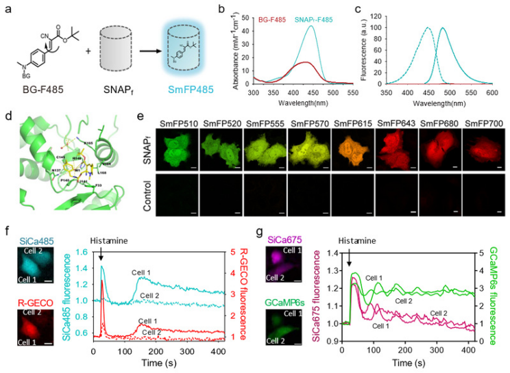 该团队针对自催化蛋白质标签SNAP-tag,设计开发了高信噪比的青色人造荧光蛋白SmFP485。SmFP485的荧光产生十分迅速,避免了荧光蛋白生色团成熟导致的延迟,因此可以用于实时监测蛋白质的合成过程。