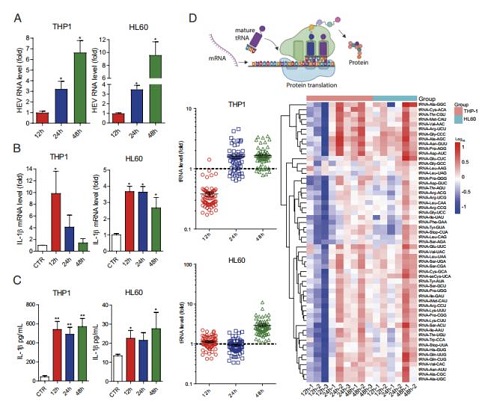 论文共同通讯作者、四川农业大学动物医学免疫学系(研究所)青年教师欧旭敏在接受《中国科学报》采访时介绍,成熟tRNAome参与解码mRNA中的遗传密码,在蛋白质合成过程中发挥着重要作用。已有研究表明tRNA表达、加工和修饰的失调与多种疾病有关,包括癌症、糖尿病等。“我们团队早期研究发现HEV感染重构了肝细胞中的成熟tRNAome,同时在感染巨噬细胞中介导了炎症小体的激活及白介素1β的分泌。”