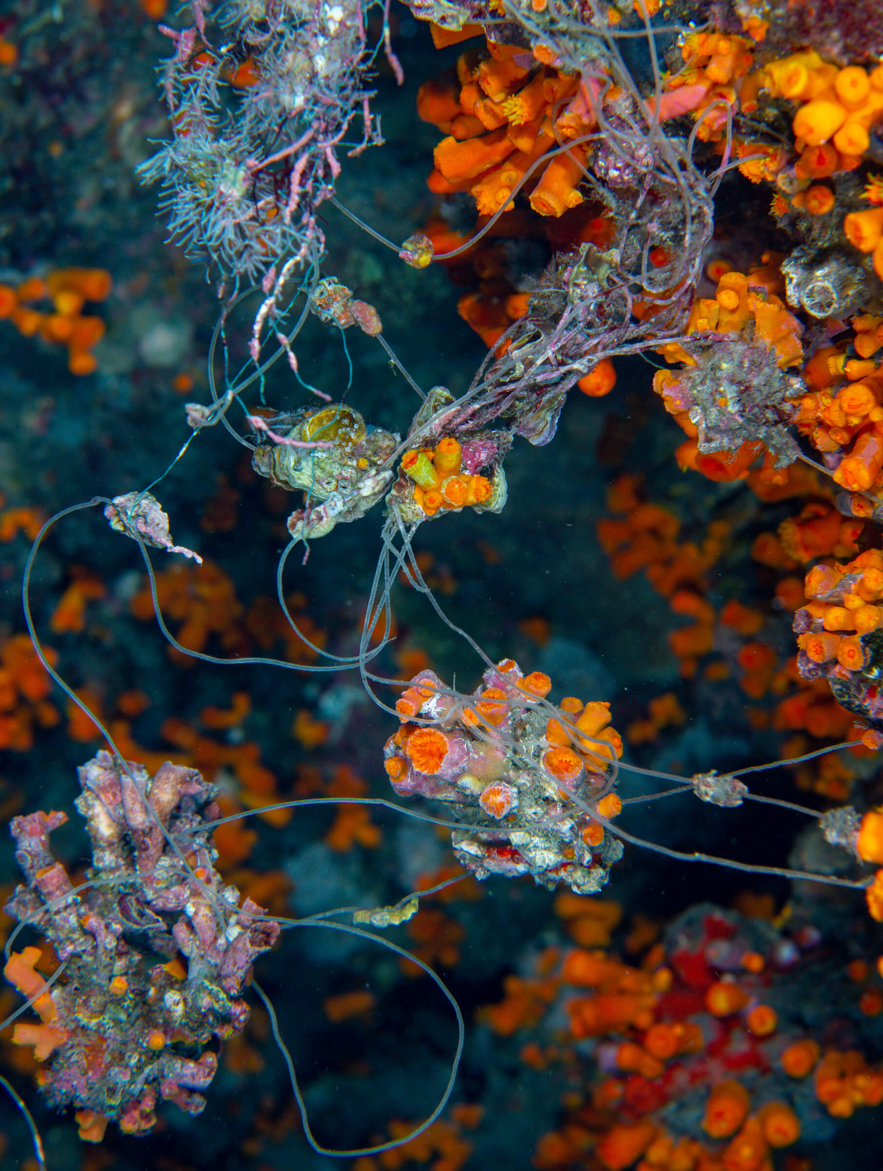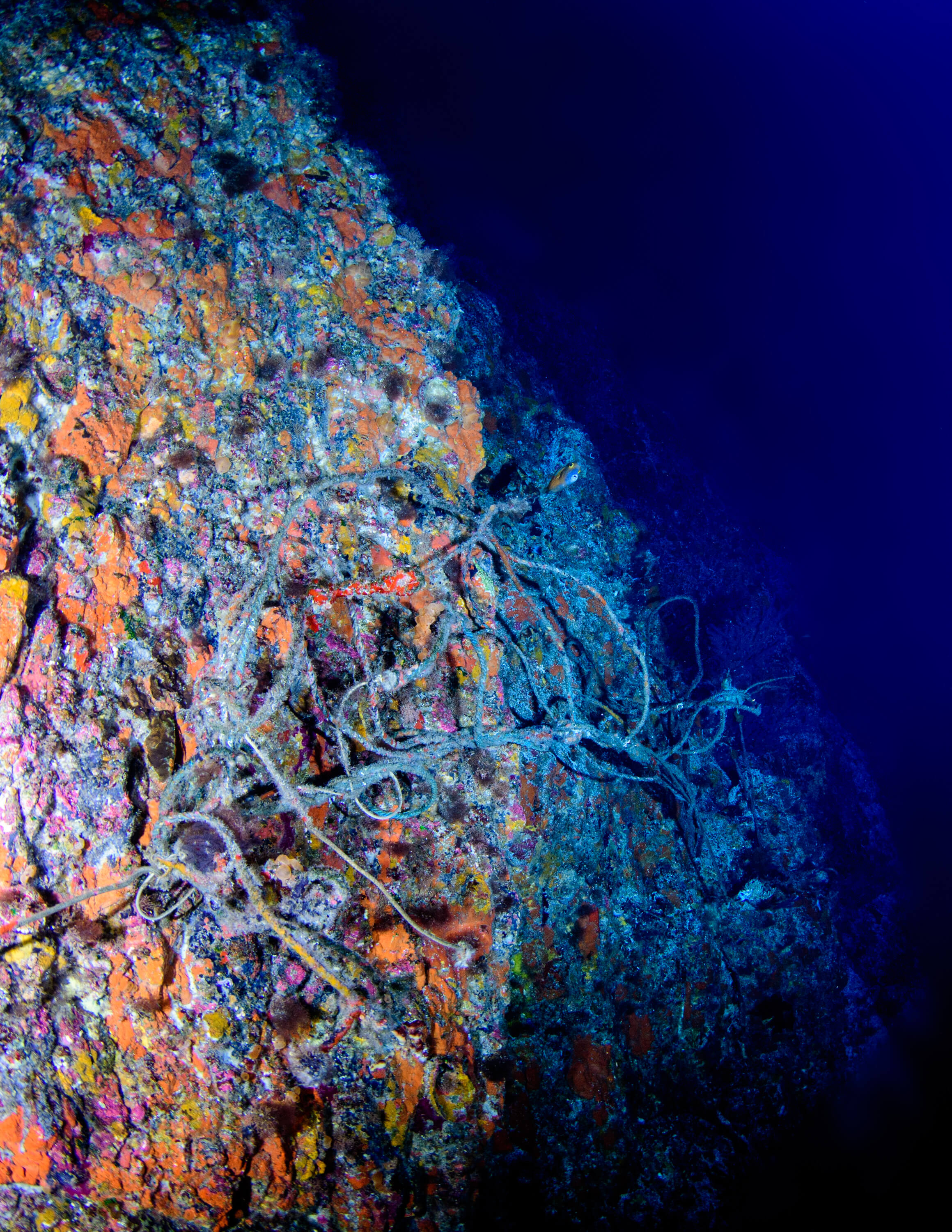 在佛得角70米深处,渔线与树珊瑚纠缠在一起并将其折断。图片来自:Luiz Rocha