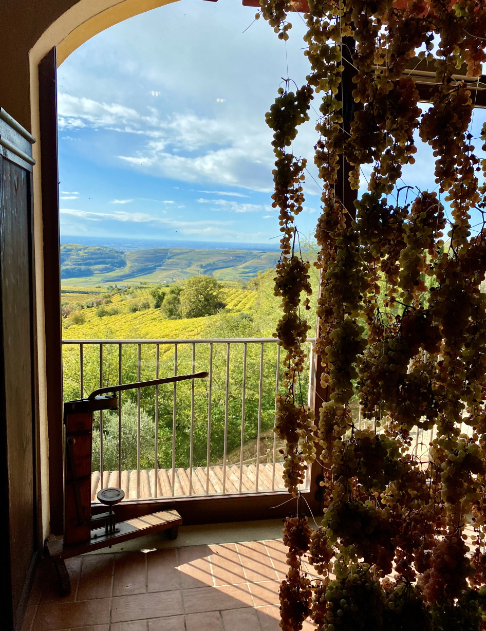 透过窗户可以看到意大利索瓦韦的传统葡萄园,种植在陡峭的斜坡上,使用appassimento工艺干燥葡萄。图片来自:Paolo Tarolli
