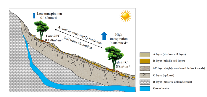 喀斯特碳酸盐岩在垂直方向上经过强烈的溶蚀作用,使得降水通过岩石的裂隙分散入渗,形成以峰丛为主的岩溶地貌。岩溶作用使得喀斯特坡面土层浅薄,持水能力较差,加之沿坡发生土壤侵蚀,导致自下而上的岩土结构、水分过程存在很大异质性,从而造成了湿润气候条件下特殊的岩溶干旱现象。