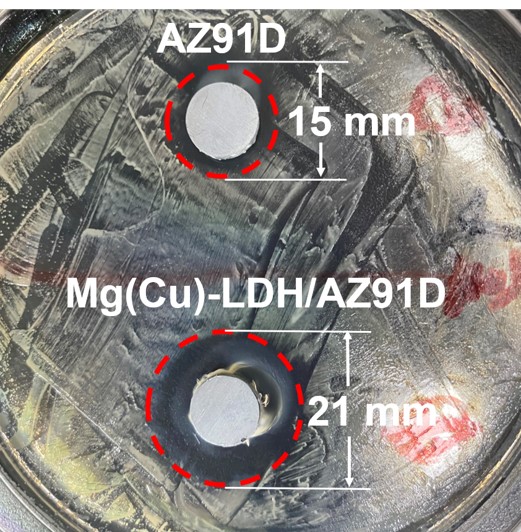 研究团队设计了一种具有LDH结构的镁合金涂层,通过共沉淀和水热处理两步法在镁合金表面构建含铜离子的镁铝层状双氢氧化物,大幅提高耐蚀、抗菌和促成骨的效果。其中短期和长期耐蚀性的提高归因于LDH屏障的作用,而镁离子和铜离子双重离子协同抗菌对大肠杆菌和金黄色葡萄球菌有良好的抑制作用。