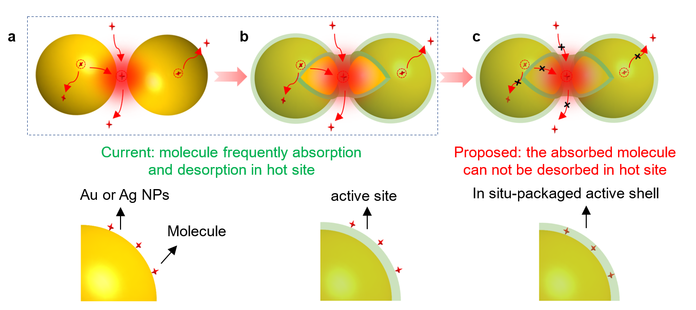 (a) SERS的传统概念 (b) 1997年,SM-SERS中活性位点概念 (c) 本工作所提出的限域增强拉曼光谱概念。(论文课题组供图)