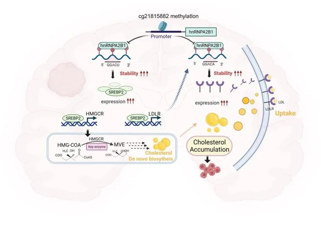 研究团队结合细胞学和分子生物学实验,证明hnRNPA2B1具有调控胶质瘤细胞增殖和干细胞活力的潜在能力,特别是hnRNPA2B1能够通过m6A修饰依赖的方式靶向调控胆固醇调节元件结合蛋白SREBP2的表达,进而转录激活其下游靶基因HMGCR和LDLR,促进外源胆固醇摄取和内源胆固醇的从头合成途径。