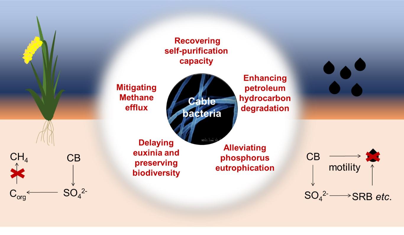 综述认为,电缆细菌利用其独特的长距离电子传递功能在缓解生态环境问题方面展现出了巨大的潜力:一是,通过提高沉积物的氧化还原电位和形成电场,促进有机物氧化和矿物质溶解,从而增强沉积物的自净能力;二是,通过与周围微生物协同互作,降低环境中硫化氢的毒性,提高污染物的生物可利用性,从而促进石油烃等难降解有机污染物的去除;三是,通过抑制沉积物中磷的溶解和释放,从而减少水体的富营养化;四是,在季节性缺氧的海洋环境中,通过消耗硫化物并形成铁的氢氧化物屏障,阻止富硫环境的形成,从而保护生物多样性;五是,在稻田环境中,通过创造富含硫酸根的环境条件而抑制产甲烷菌的生长,从而减少甲烷排放。