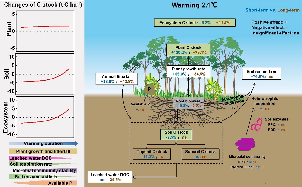 该研究利用鼎湖山站的长期野外自然增温实验平台,研究了南亚热带森林生态系统碳动态对长期增温的响应模式及驱动机制。研究发现,在增温2.1℃下,南亚热带森林生态系统碳储量在短期增温下(1-2年)降低3.8%,但在长期增温下增加13.4%。生态系统碳储量随增温持续时间的相反变化主要是由于植物和土壤碳动态对长期增温的异步响应与适应引起的。短期增温同时促进了植物的生长和土壤呼吸,但由于更高的土壤呼吸碳排放,森林生态系统碳储量降低。长期增温下,由于养分供给的缓解和植物的生理适应,植物仍能维持高的碳封存能力;同时由于土壤微生物的热适应和土壤水分含量降低时土壤碳损失减弱以及植物碳输入的增加使土壤有机碳库保持稳定,因而生态系统碳储量增加。