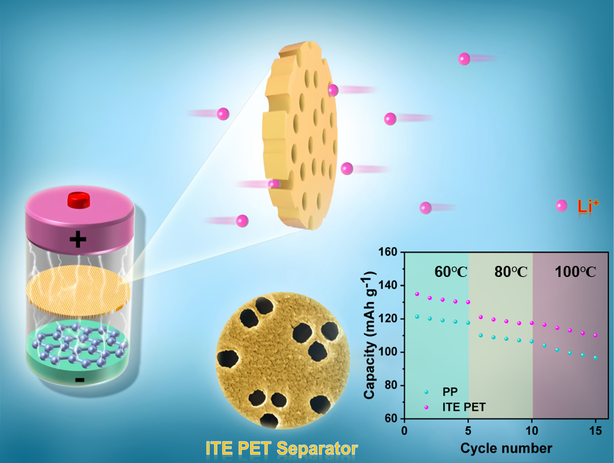 科研人员借助兰州重离子研究装置(HIRFL),将重离子辐照技术与化学蚀刻工艺相结合,以PET(聚对苯二甲酸乙二醇酯)膜为基材,成功开发一种PET基耐高温锂离子电池隔膜。该锂离子电池隔膜相较于商业聚烯烃隔膜,不仅具有更加均一的孔径分布和更优异的电解液润湿性,而且所制备的PET隔膜表现出良好的耐高温性能(热收缩率小于3%@180℃)。电池测试结果表明,PET隔膜具有更高的锂离子迁移数(0.59)以及优异的常温和高温循环性能。