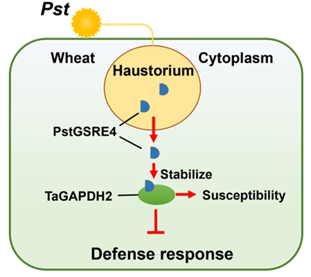 研究明确了条锈菌效应子PstGSRE4通过靶向并稳定小麦感病因子TaGAPDH2促进病菌对小麦的侵染,丰富和加深了我们对活体营养寄生真菌致病机制及TaGAPDH2在植物免疫中功能的理解,推动了小麦抗锈病的种质创新,为植物锈病的持久绿色防控提供了理论依据。
