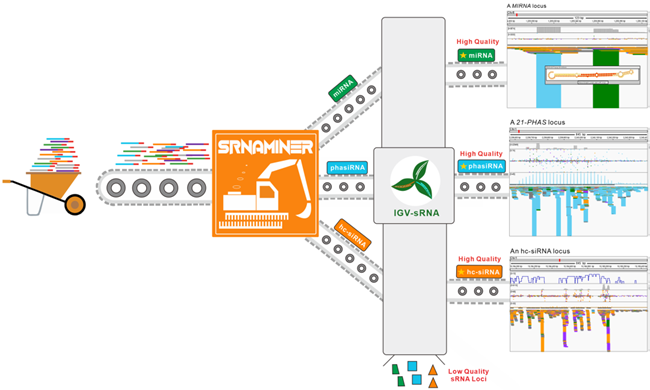 该团队开发的sRNAminer包含了常用的植物小RNA数据分析功能。其功能主要分为四大部分:一是数据预处理,包括接头去除,数据去冗余,去除目标外的非编码RNA和质体污染以及读段回帖;二是植物三种主要类型小RNA的鉴定与表达量计算;三是包括小RNA靶位点预测、介导PHAS位点产生的小RNA trigger预测、降解组测序数据分析等常用的功能;四是小RNA位点可视化。其中,sRNAminer的IGV-sRNA模块让用户能够针对相应类型的小RNA的特征对小RNA位点进行快速人工检查。