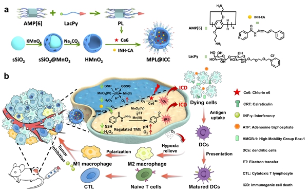 近年来,基于癌症纳米疫苗的免疫疗法,由于其潜在的高疗效、特异性和可产生长期免疫记忆效应的能力,有望成为改变癌症治疗模式、根除肿瘤和预防肿瘤复发的最有效方法之一。然而,较差的免疫原性和免疫抑制的肿瘤微环境限制了纳米疫苗介导的免疫疗法的治疗效果。鉴于此,该团队设计和制备了一种Mn(III)介导生成的碳中心自由基提高免疫原性细胞死亡(ICD)的纳米疫苗(MPL@ICC)用于增强免疫疗效。MPL@ICC由氨基柱[6]芳烃和乳糖吡啶主客体络合物修饰的二氧化锰(MnO2)纳米载体负载异烟肼前药和二氢卟吩e6组成。该纳米疫苗具有良好的生物安全性、对肝癌细胞的靶向性和肿瘤部位的富集性。最重要的是,它可以调节肿瘤微环境使Mn(III)得以稳定存在,Mn(III)进一步介导碳中心自由基的生成,从而加强ICD实现增强的免疫治疗效果。该工作为设计高效的癌症治疗型纳米疫苗实现肿瘤消除和预防肿瘤复发提供了一种新的策略。