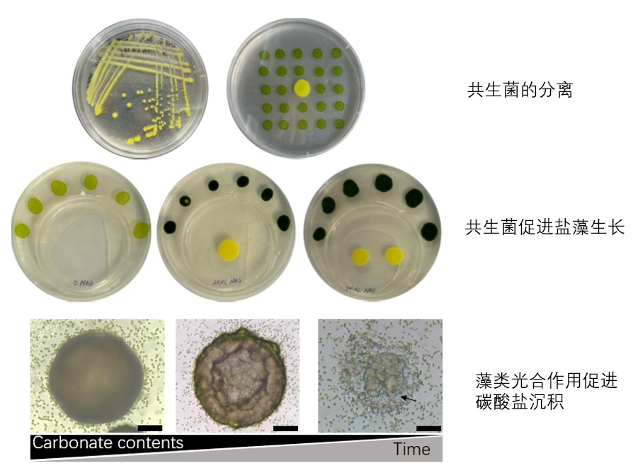 共生菌促进了盐藻生长,同时盐藻的光合作用可促进碳酸盐沉积。课题组供图