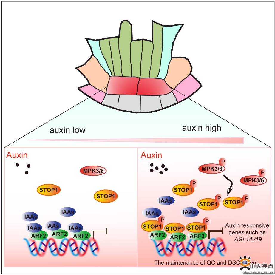 研究人员发现,锌指结构家族转录因子STOP1在根尖干细胞微环境维持过程中发挥重要功能。生长素激活的蛋白激酶可以与该转录因子发生相互作用,并使该转录因子发生磷酸化,从而促进该转录因子响应生长素大量积累。