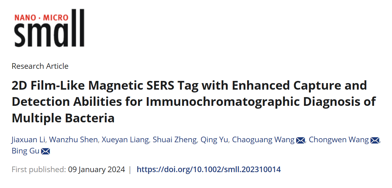 目前,该团队已开发出同时检测金黄色葡萄球菌、铜绿假单胞菌和鼠伤寒沙门氏菌的免疫检测试剂,灵敏度可达10 cells/mL,检测时间小于30分钟。该方法在尿路感染临床样本中展现出稳定性能,具有进一步开发成商业化试剂的巨大潜力。相关研究以2D Film-Like Magnetic SERS Tag with Enhanced Capture and Detection Abilities for Immunochromatographic Diagnosis of Multiple Bacteria为题发表Small杂志上。