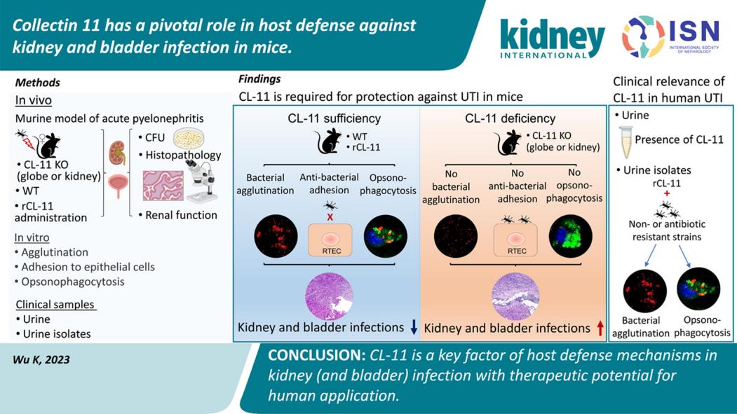 近日,西安交通大学第二附属医院科研中心实验室李可教授团队在泌尿系统感染的发病机制研究中取得重要进展,团队发现胶原凝集素11(Collectin 11, CL-11)可通过介导固有免疫限制病原菌扩散,可用于临床上难治疗的耐药菌株感染,在宿主抵抗尿路感染中发挥着重要作用。相关研究成果在线发表在《国际肾脏病》上。