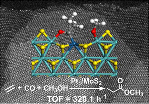 单原子催化剂作为一种特殊的无有机配体的单核多相催化剂,有望为传统均相催化的羰基化反应带来新的机会。本工作中,张涛、王爱琴团队研制了一种MoS2纳米片负载的Pt单原子催化剂Pt1/MoS2,其中Pt单原子和近邻配位不饱和的Mo原子组成Mo-S-Pt-S-Mo结构。得益于Pt单原子和载体的协同作用,Pt1/MoS2可在不添加酸助剂的条件下催化乙烯羧甲酯化反应,TOF值达320h-1,可媲美均相催化剂,而且具有优良的选择性和循环使用性能,在TOF值150h-1功率下选择性达到91%,且循环使用4次以后TOF值维持在90h-1,且无金属流失。