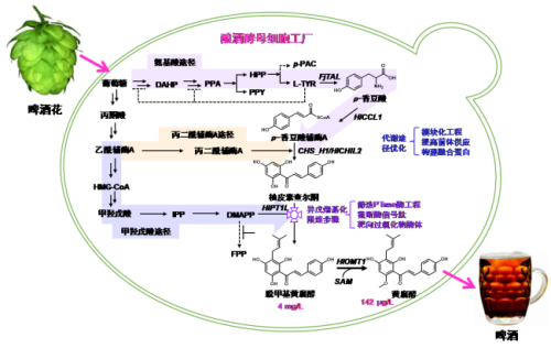 黄腐醇是一种异戊烯基化的黄酮类化合物,来源于啤酒花植物,在工业上主要应用于啤酒酿造,不仅能改善啤酒风味,还具有多种生物活性,如预防癌症、抗氧化、抗炎和免疫调节等作用。目前,黄腐醇主要从啤酒花中提取,由于培育植物受地理、气候等因素影响,以及植物中黄腐醇的含量低、分离纯化困难,且结构不稳定导致酿造过程中损失率达80%至90%,因此,需要发展其他生产路线供应黄腐醇。利用微生物细胞工厂,通过引入异源黄腐醇合成途径并改造和平衡内源代谢途径,有望实现黄腐醇的生物合成。