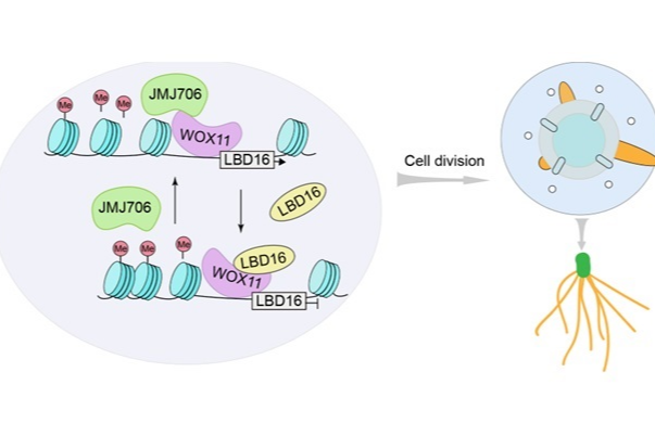通过遗传学、生物化学和细胞生物学方法联合分析,团队发现植物特有的转录因子LBD16是水稻冠根发育调控的变阻器。在水稻冠根发育过程中,WOX11能够招募组蛋白H3K9去甲基化酶JMJ706,去除其下游靶基因LBD16上的H3K9me2修饰,从而激活LBD16的表达。