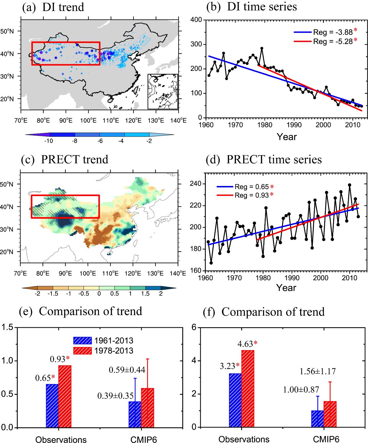 我国西北干旱区位于亚洲内陆深处,常年降水量偏少,属于典型的内陆干旱和半干旱区,该区域生态环境脆弱且对气候变化的响应敏感。近几十年来,西北地区持续变湿,表现为地表降水增加、主要河流径流量加强、湖泊水位上升及植被恢复等现象,但西北干旱区气候变湿的原因尚不完全清楚。同时,在全球变暖背景下近几十年来西北干旱区沙尘活动也显著减弱 。