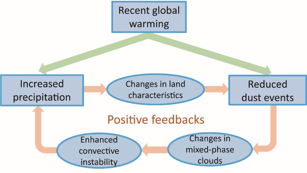 近日,中国科学院地球环境研究所气候变化集成-模拟-同化-预测科研团队解小宁研究员等联合中国气象科学研究院及美国布鲁克海文国家实验室科学家的最新研究表明,源区沙尘活动减弱与西北干旱区变湿之间可能存在着因果联系,相关研究成果发表在Environmental Research Letters上。