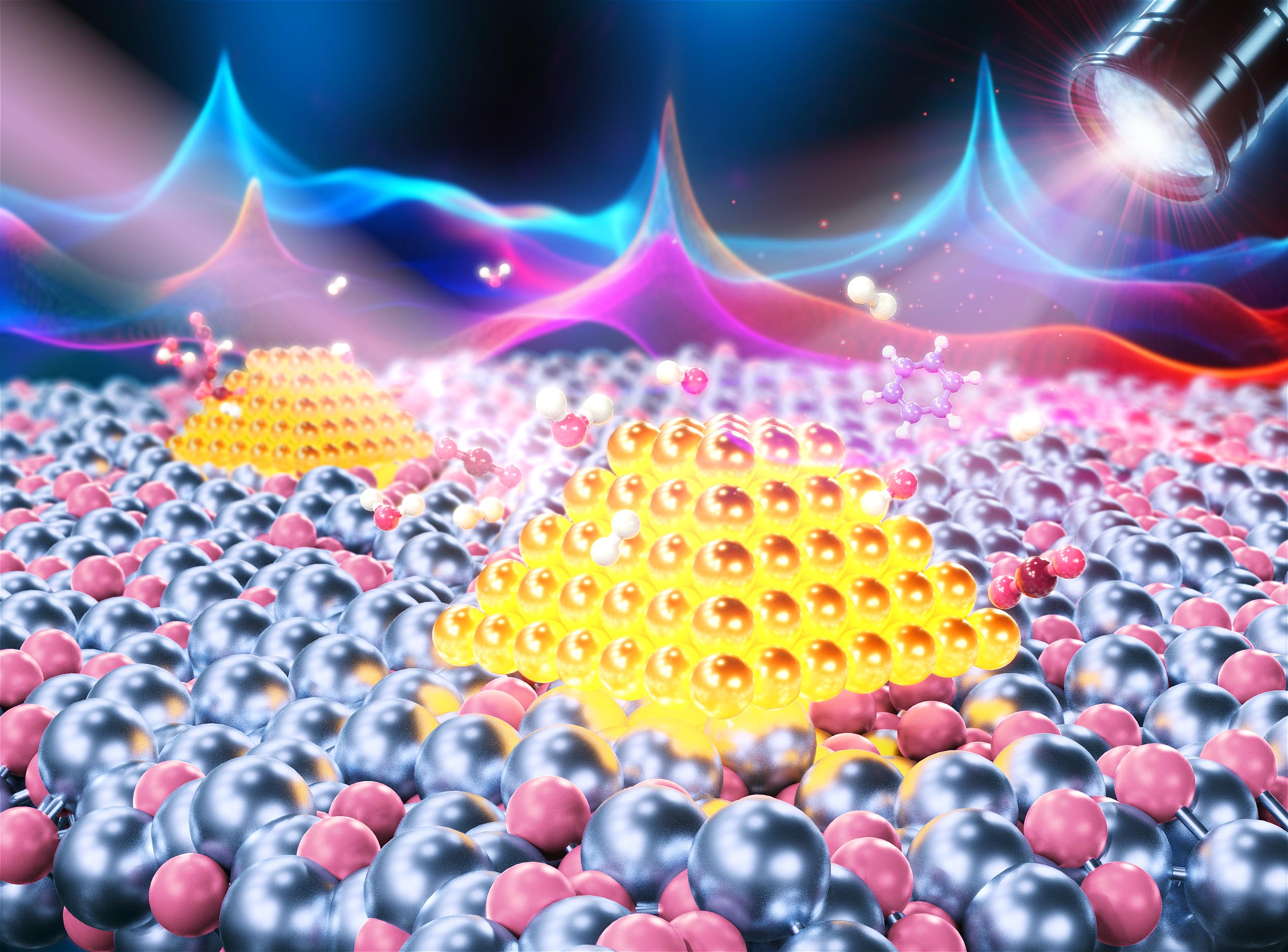 表面增强拉曼散射(SERS)是一种高灵敏的表/界面分子和官能团分析检测技术,可实现气、固、液不同体系的无损检测,并避免了红外光谱中来自水和羟基的常见干扰。传统的SERS检测主要依赖于在可见光区具有强等离子共振效应的Au、Ag基底,虽然灵敏度高,但受到稳定性、循环使用性和价格等因素的限制。近年来,含贵金属的复合材料蓬勃发展,这些材料同时也是常见的光催化体系。通过SERS/光催化体系的相互关联,可实时、原位自监测光催化剂表面瞬时、低浓度表面物种的形成和演变。