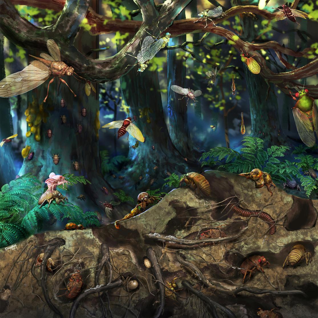 中生代森林中蝉的生态场景示意图 杨定华绘制