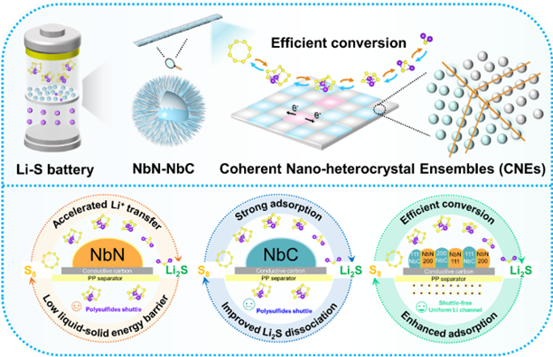 共格纳米异质晶群CNEs的制备及在Li-S电池中的作用机制示意图图片来源于《先进材料》
