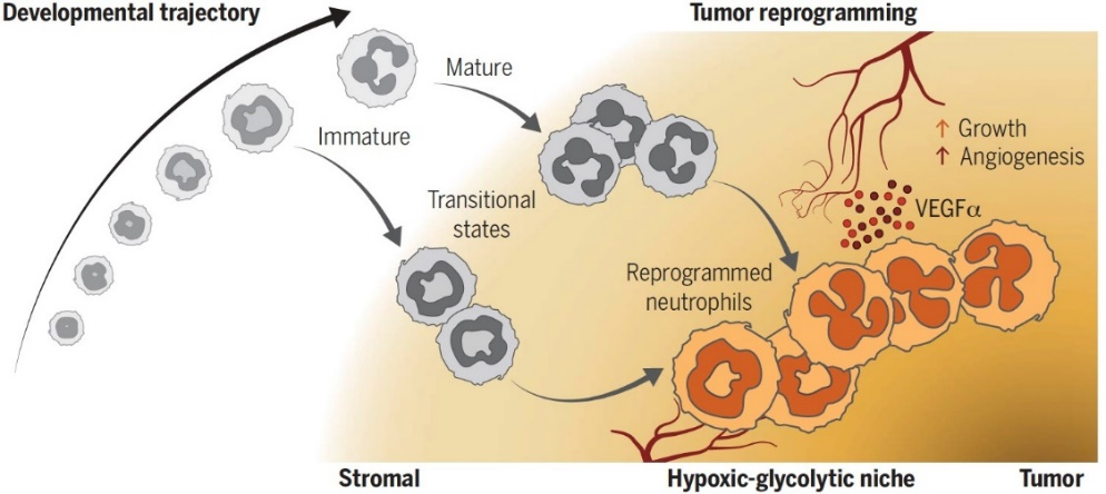 肿瘤内中性粒细胞历经共同分化路径重编程为促血管生成的中性粒细胞,支持肿瘤生长 图片来源于《科学》