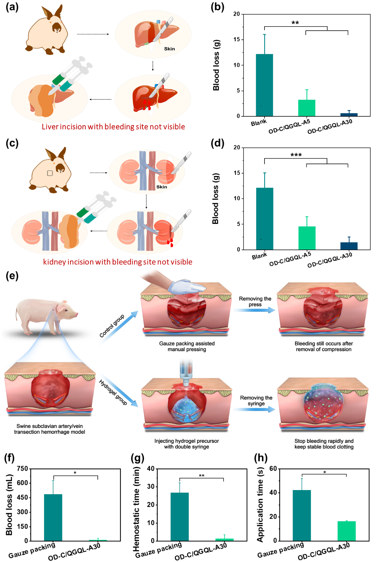 可注射、自膨胀/自推进抗菌水凝胶粘合剂用于盲视野或致死性不可按压出血止血。(图片均由课题组提供)