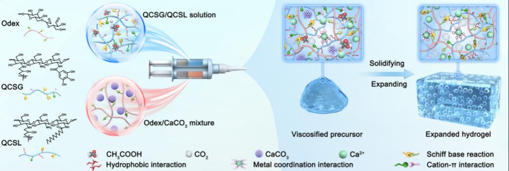 为解决以上问题,课题组在前期研究基础上,在水凝胶粘合剂中引入自膨胀和自推进性能特点,开发了一种可注射可降解的席夫碱水凝胶生物活性粘合剂。这种生物活性粘合剂具有优异的抗菌和促凝血性能、快速自膨胀和自推进性能,以及良好的湿组织粘附性,可用于快速控制大出血。用氧化葡聚糖(OD)交联月桂酸修饰的QCS(QCSL)和没食子酸修饰的QCS(QCSG)形成水凝胶网络。此外,将多孔碳酸钙和乙酸之间的发泡反应引入到上述双组分水凝胶系统中,以提供自膨胀和自推进性能。