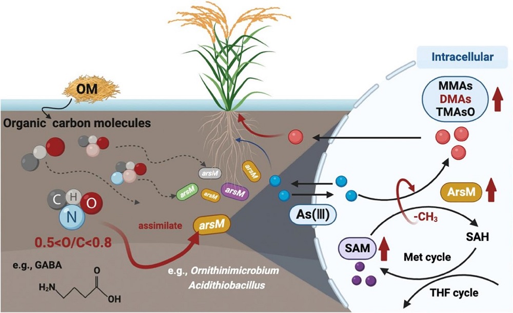 该研究明确了稻田土壤中砷甲基化功能微生物明显受到有机碳分子类型调控,发现了可显著影响砷甲基化进程的有机碳分子类型,并揭示了微生物通过加速甲基供体产生和转移,进而激发砷甲基化进程的相关机制。该研究为预测水稻旱青立病的发生提供理论支持,为稻田安全生产提供科学指导。