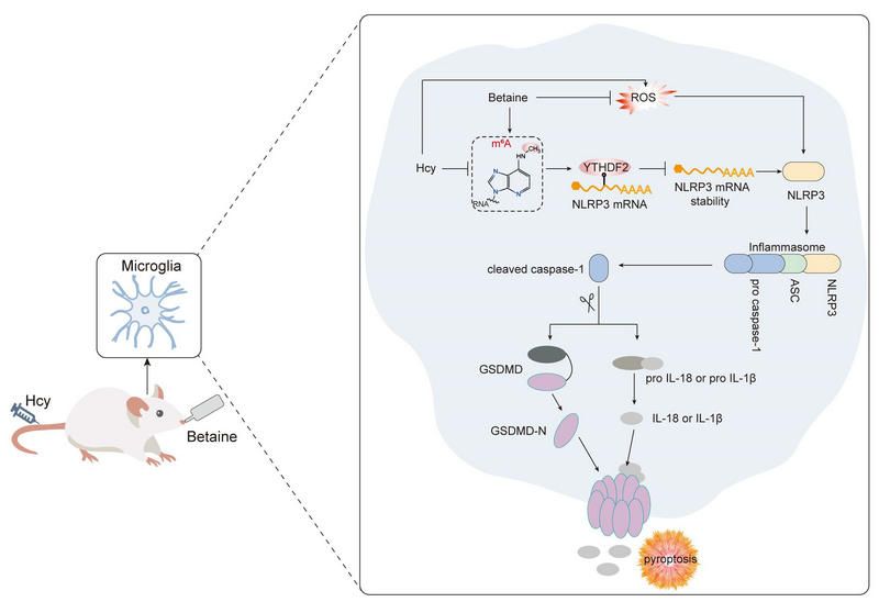 该研究利用同型半胱氨酸诱导认知障碍模型,结果发现补充甜菜碱可以增强大鼠的学习记忆能力,减少脑损伤。甜菜碱还在体外和体内抑制小胶质细胞活化和细胞焦亡。从机制上讲,甜菜碱提高了炎症小体NLRP3 mRNA的m6A甲基化水平,并增加m6A阅读器YTHDF2的表达来并降低NLRP3 mRNA的稳定性,最终抑制NLRP3/caspase-1/GSDMD通路。