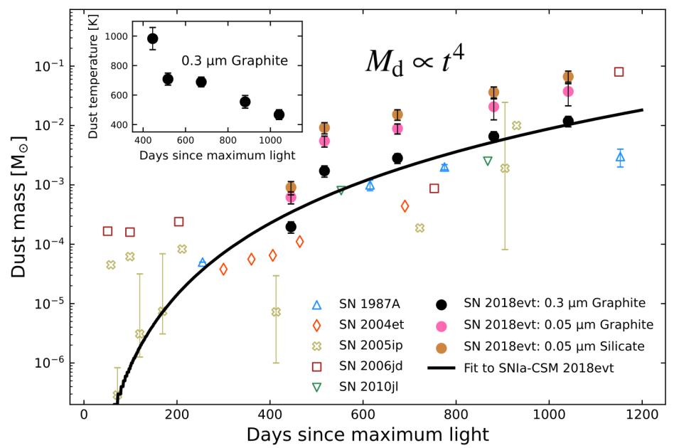 图2:SN 2018evt新生成尘埃的温度(子图)和质量演化图。数据点表示SN 2018evt和核塌缩超新星爆炸产生的尘埃演化。实线表示对超新星SN 2018evt新尘埃组分假定为0.3微米石墨的时间幂律谱演化。