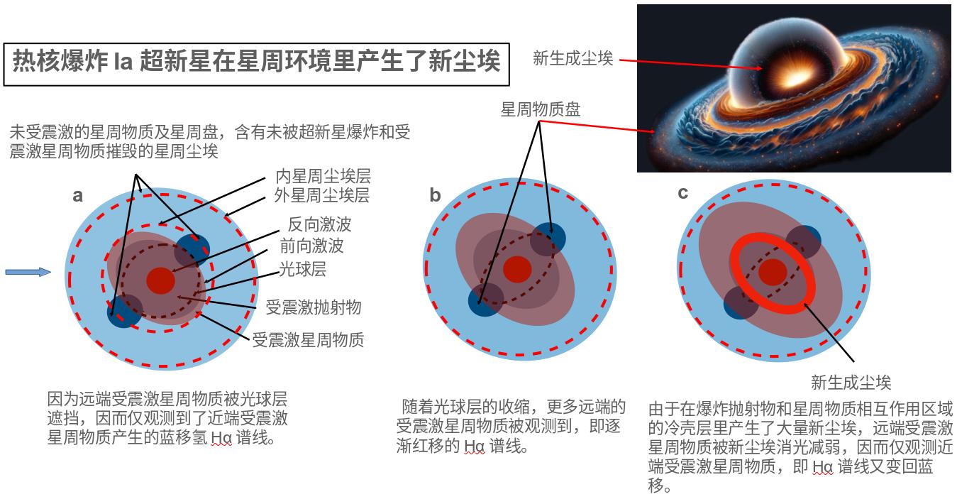 Ia型超新星爆炸产生尘埃的过程一直缺乏直接的观测证据,即同时观测到尘埃的吸收,散射和热辐射特征。此超新星系统完美的呈现了尘埃的这三项特征。由于尘埃的热辐射,它的中红外流量突然变亮;由于尘埃的吸收,它的光学流量变得更暗;由于尘埃的散射,它的颜色变蓝。此外,研究人员还发现,由于尘埃的吸收,相互作用区辐射出的Hα谱线出现红蓝强度比不对称,同时谱线中心向蓝端移动。