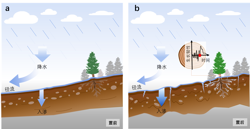 在树木生长增加的地区,地震后树木生长对生长季降水的利用率升高。遥感观测的土壤水与降水的相关关系在地震后也减弱,说明土壤水增加。这些证据表明,地震扰动后产生地表裂隙与松动的树根或岩石与土壤的接触面,有利于大孔隙流的形成,增加生长季降水入渗;在降水较多的地区,过度增加的入渗可能引发土壤侵蚀和养分流失,不利于树木生长。