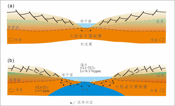 在大陆裂解过程中,地幔橄榄岩逐渐上浮,露于海底。海水渗透到尚处于较热状态的地幔橄榄岩中。在这个阶段,地幔橄榄岩具有足够的能量,供海水中的锂元素扩散到橄榄石中,并且锂同位素分馏程度非常低,使得橄榄石保存了海水锂同位素特征。