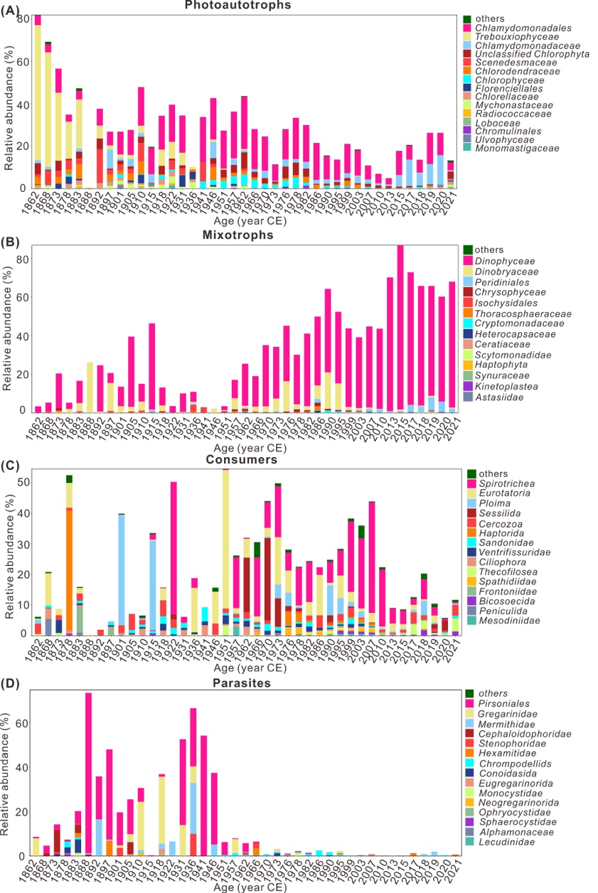 研究结果表明20世纪中叶以来真核微生物组成的变化与人为污染物排放如重金属、碳燃烧指数、放射性核素指标,以及营养盐和温度的变化相一致。多种统计分析显示,人为污染物加速了20世纪中叶以来真核微生物群落结构重组。