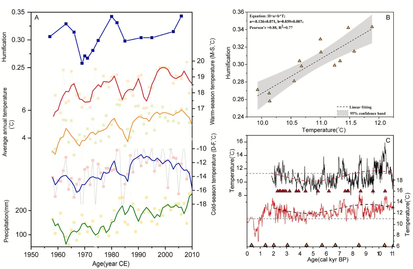 中国科学院地球环境研究所周卫健院士团队在我国西北干旱区获取了两个高分辨率泥炭剖面,并结合近几十年的现代过程分析定量重建了全新世暖季温度变化历史,通过汇总现有的温度重建定量记录,获得了中亚干旱区全新世暖季温度变化的综合曲线,近日该研究成果发表在Quaternary Science Reviews上。