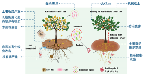 柑橘黄龙病防治策略示意图:生物防治协同严格的土壤物理、化学、生物学指标的修复改良和其他非HLB因素的病虫害控制。(研究团队供图)