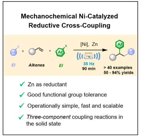 与传统基于溶剂体系的还原偶联策略相比,该机械化学合成体系具有多项优点。可在空气中进行反应,无需严格的无水无氧操作,简化了反应装备,降低了总体成本和操作复杂性。使用稳定且易得的烷基溴化物作为起始原料,避免了对空气敏感或制备过程复杂的预活化试剂的使用,增加了反应的普适性和可扩展性,使其更易被广泛应用。反应时间短,仅需1.5小时即可实现快速高效的转化,相比传统策略大大缩短了反应时间。