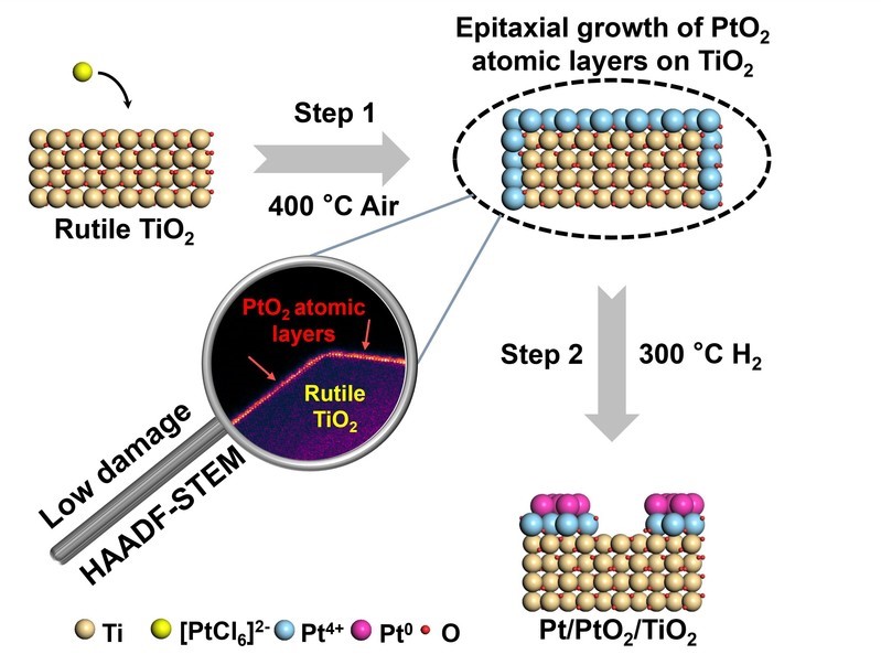 金红石型TiO2上外延生长PtO2原子层的合成表征示意图 图片来源于《美国化学会志》