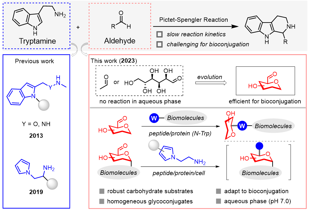 基于C6-氧化的糖底物独特的反应特性,研究团队发展了一类生物分子N端色氨酸选择性的糖修饰策略,解决了传统Pictet-Spengler反应在生物偶联中效率低下的难题,首次实现了蛋白N端色氨酸选择性定点修饰,构建了一系列结构均一且连接稳定的糖偶联物。